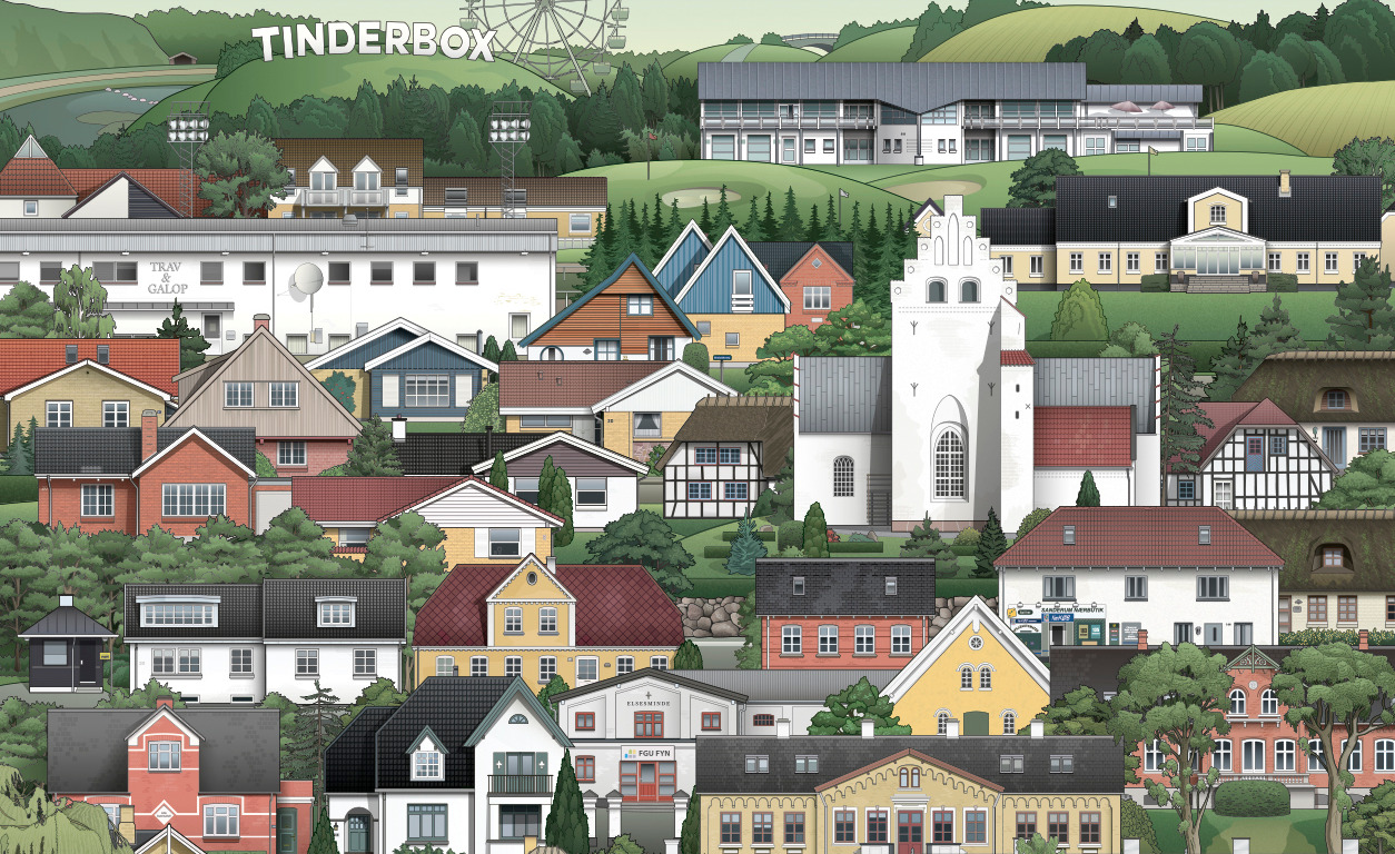 Til plakaten har jeg tegnet (næsten) alle de bygninger og landmærker, som er særlige og genkendelige for Sanderum og klemt dem godt sammen, således til en essens af byen.
